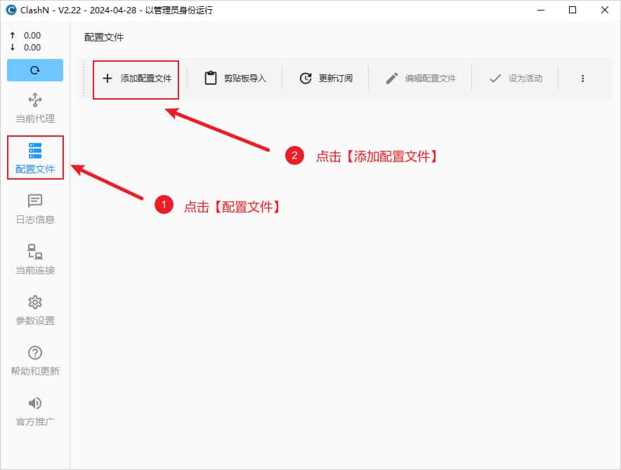然后点击界面左侧菜单配置文件,点击添加配置文件,如下图所示。