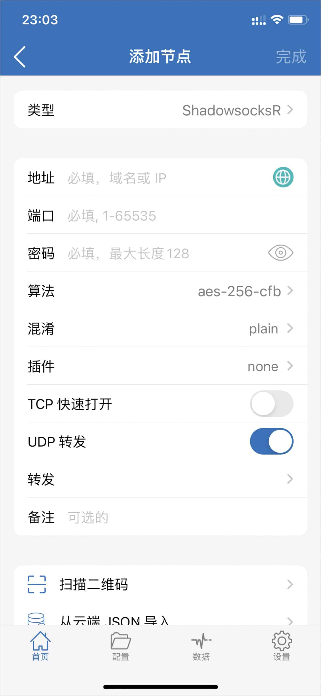 点击软件主界面左上角 ➕ 按钮,在弹出窗口进入添加节点界面,类型选择 ShadowsocksR 后,出现 ShadowsocksR 配置界面。如下图所示。