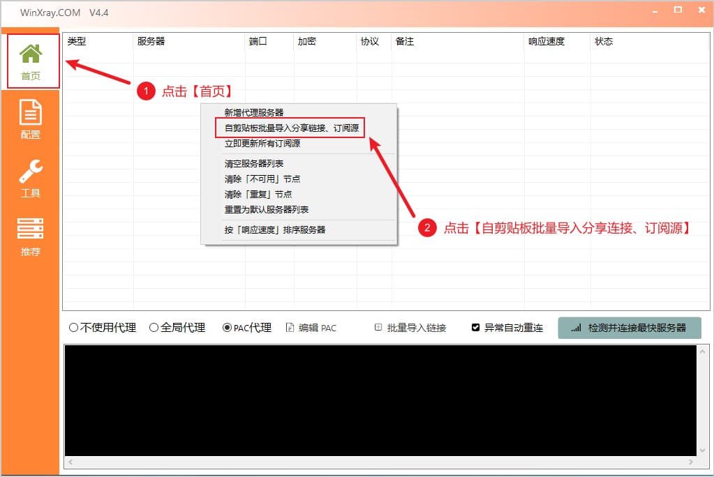 从剪贴板导入节点订阅地址,首先从节点服务商处复制节点订阅地址到剪贴板,然后点击软件左边菜单的首页,在右边服务器列表空白处单击鼠标右键,在弹出的窗口中单击自剪贴板批量导入分享连接、订阅源即可,如下图所示: