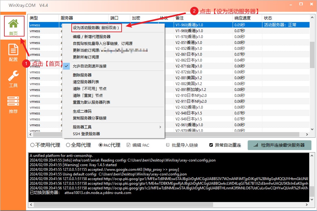 点击软件主界面首页,然后选择任意节点,在节点上单击鼠标右键,单击设为活动服务器即可,如下图所示: